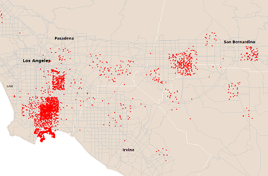 Beyond mapping and analysis, we model the freight system, identifying inefficient practices, and modeling alternatives. For example, consider deadhead travel (bobtailing, left) and the repositioning of chassis and empty containers. They represent 60% of all trips. In the Los Angeles basin, transport of empty marine containers accounts for 10,000 trips daily, or 250,000 miles of travel. With a small set of empty storage yards (ESYs) optimally located in the Los Angeles basin, we estimate savings of 46,000 miles of truck travel, 51 tons of CO2 emissions, and 4,500 fewer entries into the ports—reducing terminal congestion. Each day.